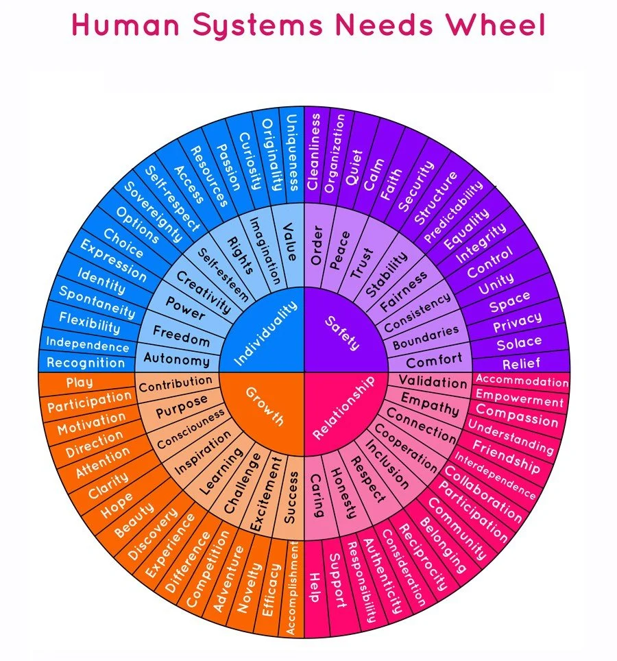 Explore through this colorful wheel to identify our four basic needs and their associated needs.